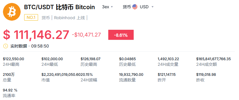 比特币一度大跌13%,跌破110000美元。截至今日9时58分,过去24小时内下跌8.61%。根据Coinglass的数据,过去24小时内,约有100亿美元的加密押注被清空,为至少自今年4月初以来最大的一轮强制平仓浪潮。