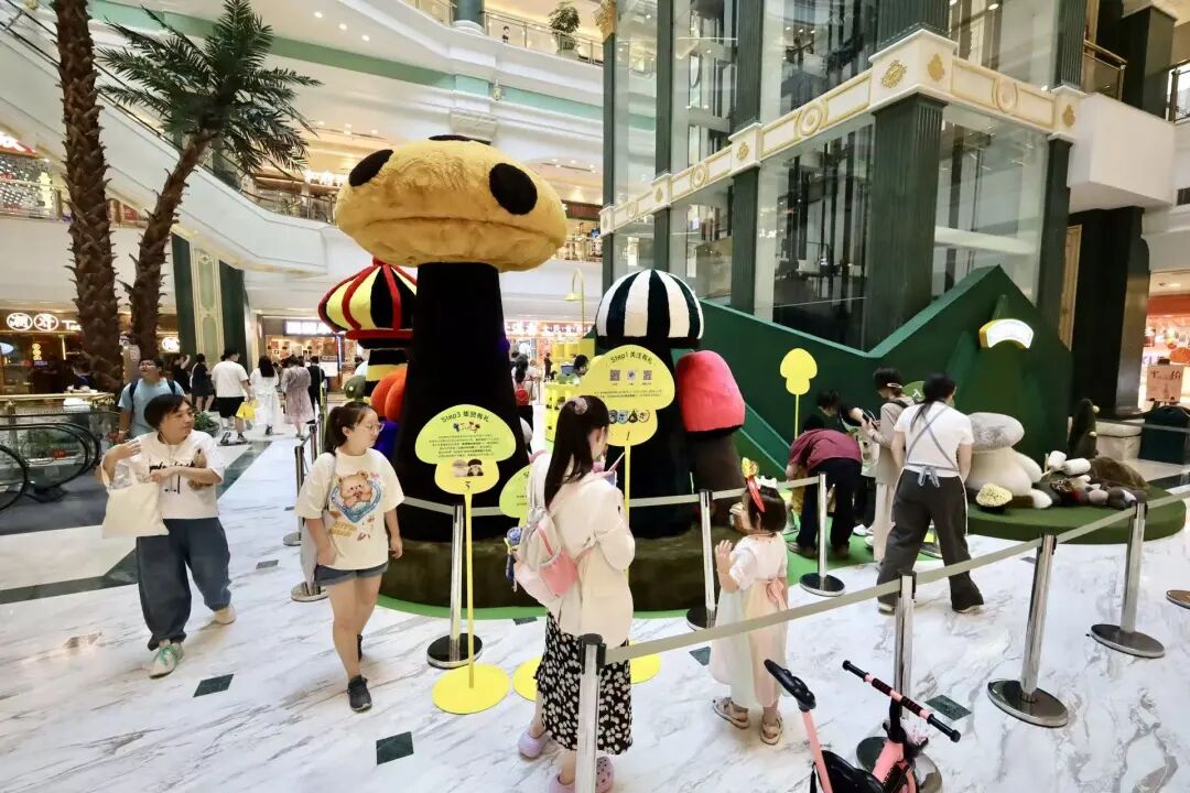 室内空间,科技与奇幻元素则为亲子家庭带来了不少乐趣。花园厅的蘑菇丛林快闪活动以其可爱的巨型蘑菇玩偶,成为了小朋友们争相合影的热门地点。而科技集合店RenX TECH在南门及B1层设置的体验点位更是人头攒动,宇树机器人及机器狗的现场互动让孩子们感到新奇不已。中央厅的大众新品快闪也吸引了大量目光,科技感与潮流感的结合,满足了消费者多样化的逛赏需求。