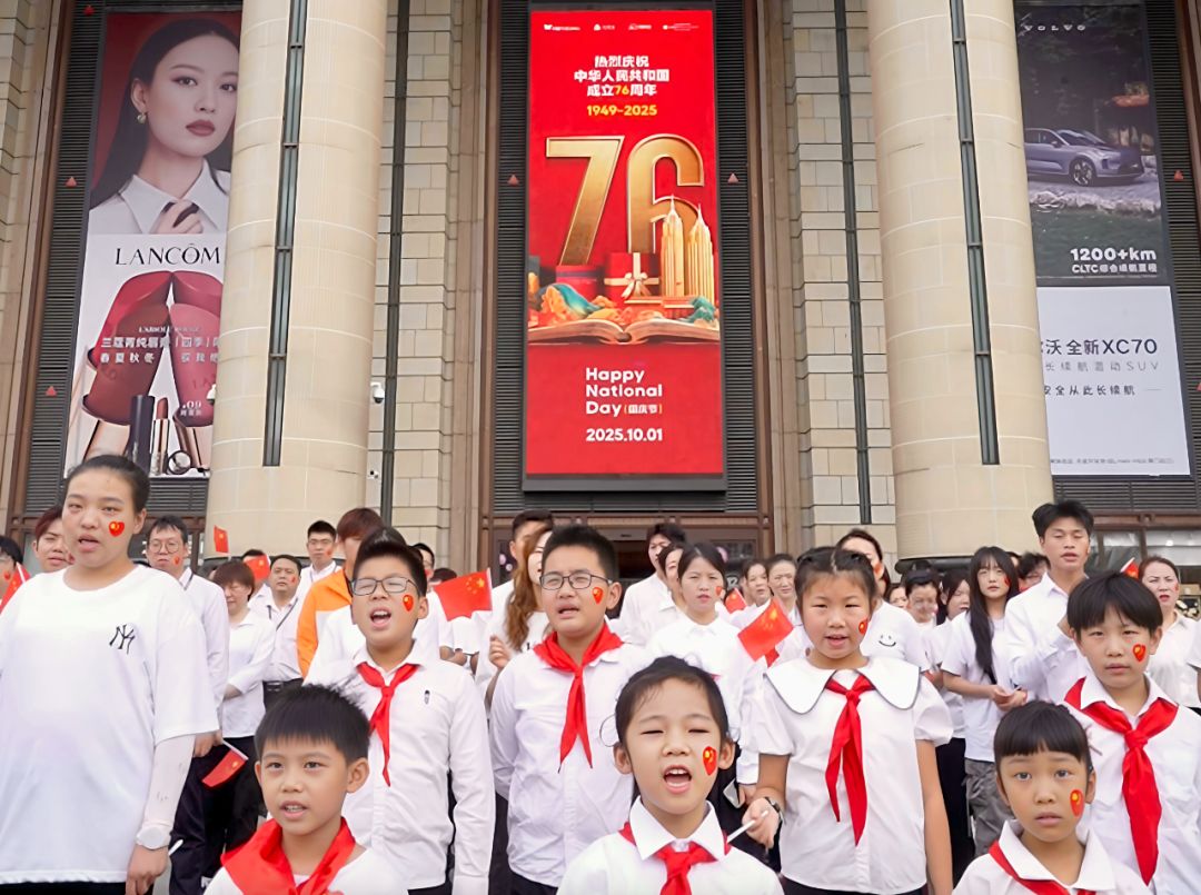 长假首日,上海环球港南广场便被激昂的歌声唤醒。一场百人快闪《我和我的祖国》在这里深情上演,市民与员工组成合唱团,以红旗为背景,用歌声献礼新中国76周年华诞。“每次听到这首歌都特别感动,今天和大家一起唱,更是心潮澎湃。”一位带着孩子前来参加活动的市民说道。